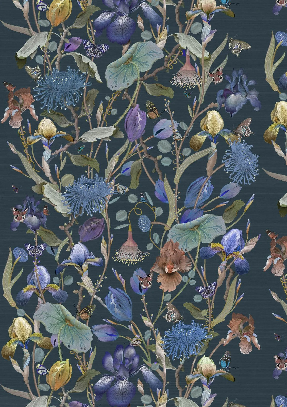 Royal Iris unfurls in a magnificent profusion, glimmering as if one has discovered an untouched plateau composed entirely from the rarest and most precious flowers. Butterflies and rare flora create an almost otherworldly scene. The rich palette of golden ochres, inky blues, and verdant greens imbue this curious realm with depth, luminosity, and opulence. The intricacy and control of the draughtsmanship is given full expression in this magnificent scale, speaking to the distinctive design vocabulary of the studio. The super-wide design has no horizontal repeat which intensifies the dramatic impact of the design whilst also significantly reducing waste.